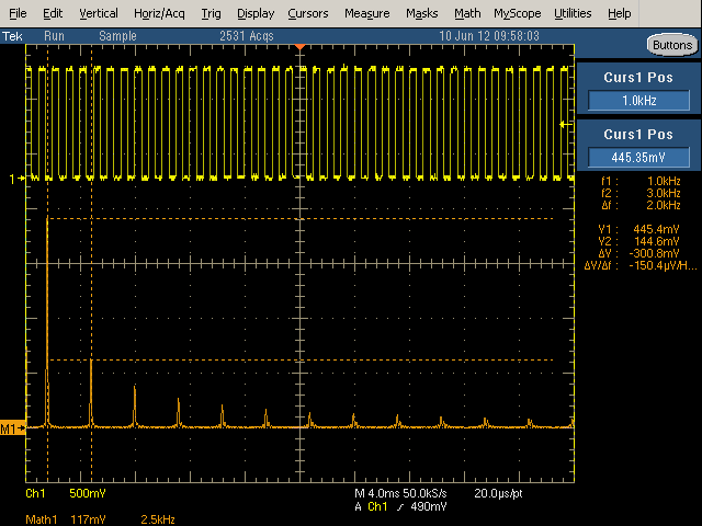 Finally, with the Center Frequency set to half of the Frequency Span, the image above shows the spectrum starting at 0. The frequency scale (Math1) is 1.56kHz per grid line, so the spikes are at 1kHz, 3kHz, 5kHz, etc. as expected. (Inconveniently, I can't find a way to get the frequency scale to be round numbers.)