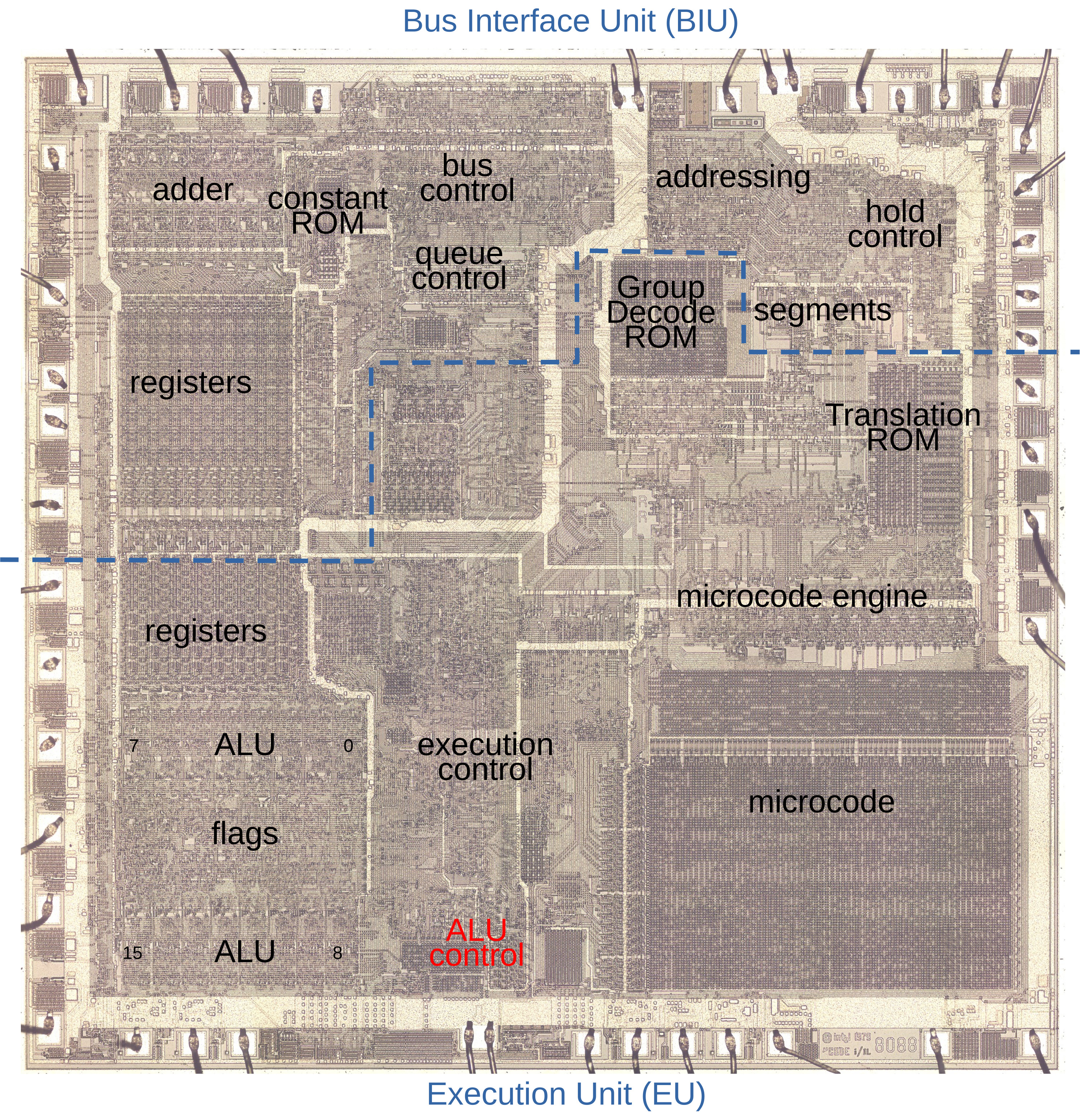 The die photo below shows the 8086 processor under a microscope. I've labeled the key functional blocks. Architecturally, the chip is partitioned into a Bus Interface Unit (BIU) at the top and an Execution Unit (EU) below. The BIU handles bus and memory activity as well as instruction prefetching, while the Execution Unit (EU) executes the instructions. In the lower right corner, the microcode ROM holds the micro-instructions. The ALU is in the lower left corner, with bits 7-0 above and bits 15-8 below, sandwiching the status flag circuitry. The ALU control circuitry, highlighted in red at the bottom of the chip, is the focus of this article.